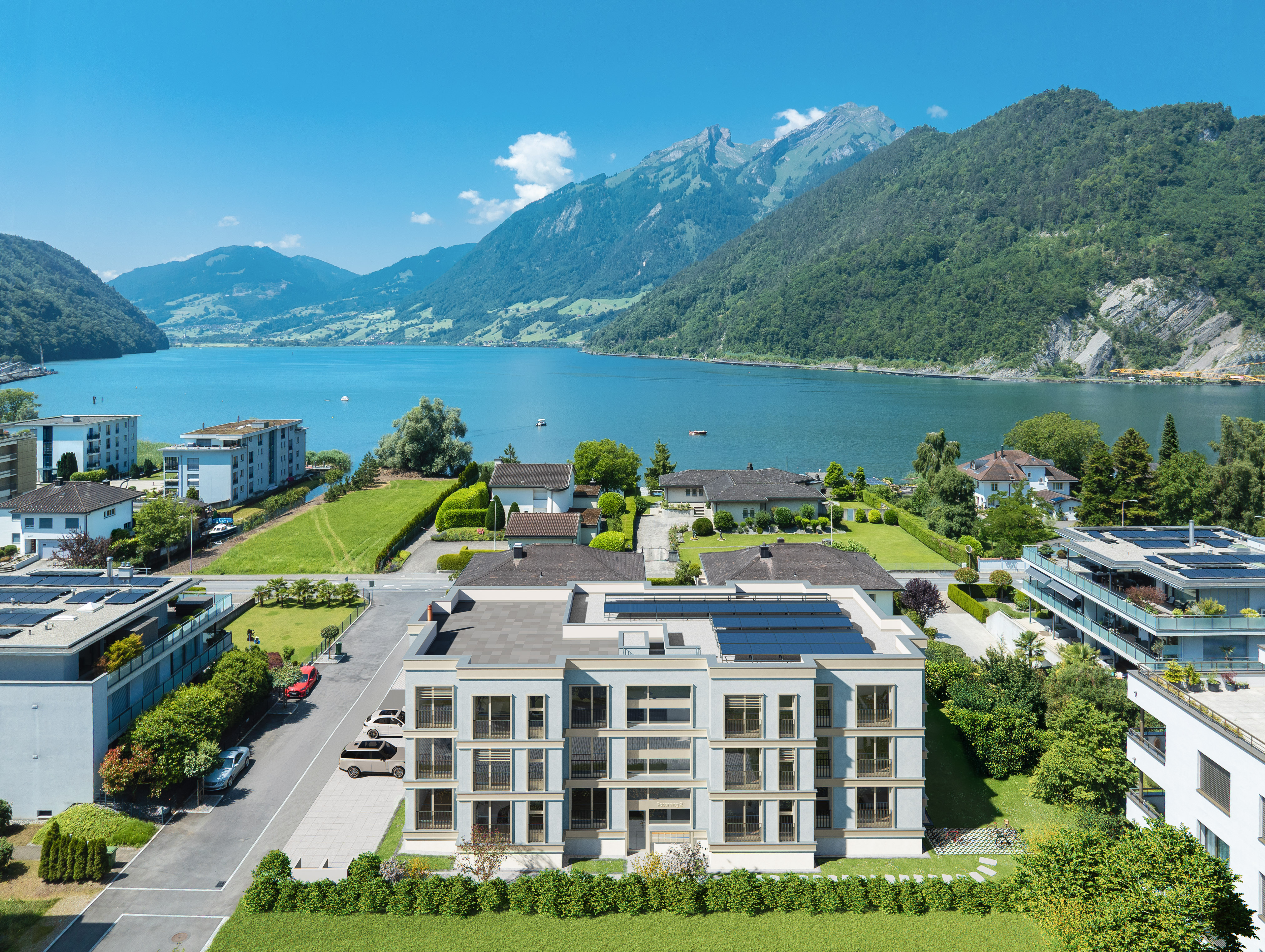 Perle unter den geschichtsträchtigen Vierwaldstätterseegemeinden: So wird Stansstad, das idyllisch zwischen dem Bürgenberg und dem Pilatus eingebettet ist, auch genannt. Hier entstehen am Rosenweg 2 und 4, in einem beschaulichen Wohnquartier unweit des Alpnacher Sees und in gut besonnter Lage neun grosszügige Eigentumswohnungen, verteilt auf drei Etagen und mit eigener Einstellhalle. Ein ausgesuchtes Zuhause für Menschen mit Anspruch an Design, urbanem Komfort und dem Wunsch, schnell und unkompliziert Zeit in der wohltuenden Natur verbringen zu wollen. Die attraktive Lage in Seenähe und die sorgfältig gestalteten Aussenräume lassen die Herzen höherschlagen, während Qualität und Langlebigkeit die Gestaltung und den Ausbau der Wohnungen prägen. Diese überzeugen mit hohem Komfort, intelligenten Grundrissen, designorientierter Ausstattung und nachhaltiger Energieversorgung.